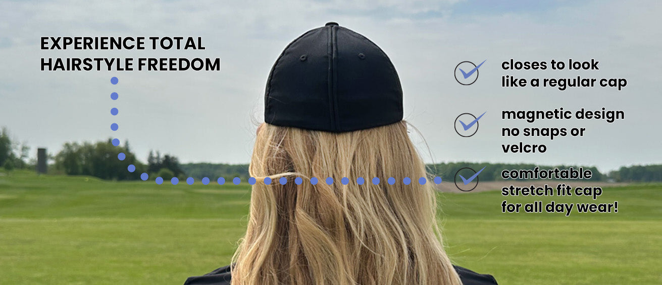 Ponyback's large patented magnetic seam allows hairstyles at any height! From the top button to the bottom of the band. The flexible magnetic seam wraps around your style, or for those with thick locks can open wide to accommodate thick and curly hair. Regular caps are one size fits most, whereas Ponyback comes in inclusive sizing to fit you and your head shape!