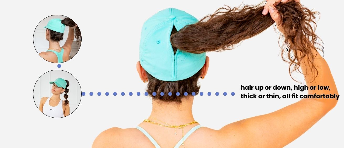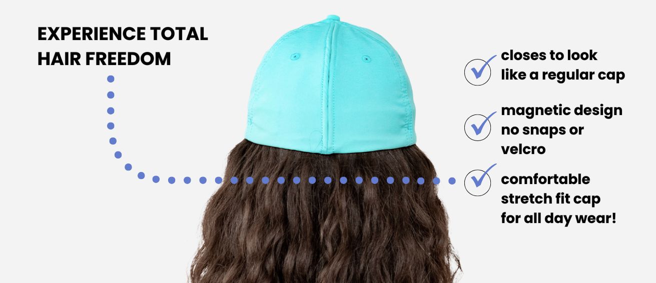 Ponyback's large patented magnetic seam allows hairstyles at any height! From the top button to the bottom of the band. The flexible magnetic seam wraps around your style, or for those with thick locks can open wide to accommodate thick and curly hair. Regular caps are one size fits most, whereas Ponyback comes in inclusive sizing to fit you and your head shape!