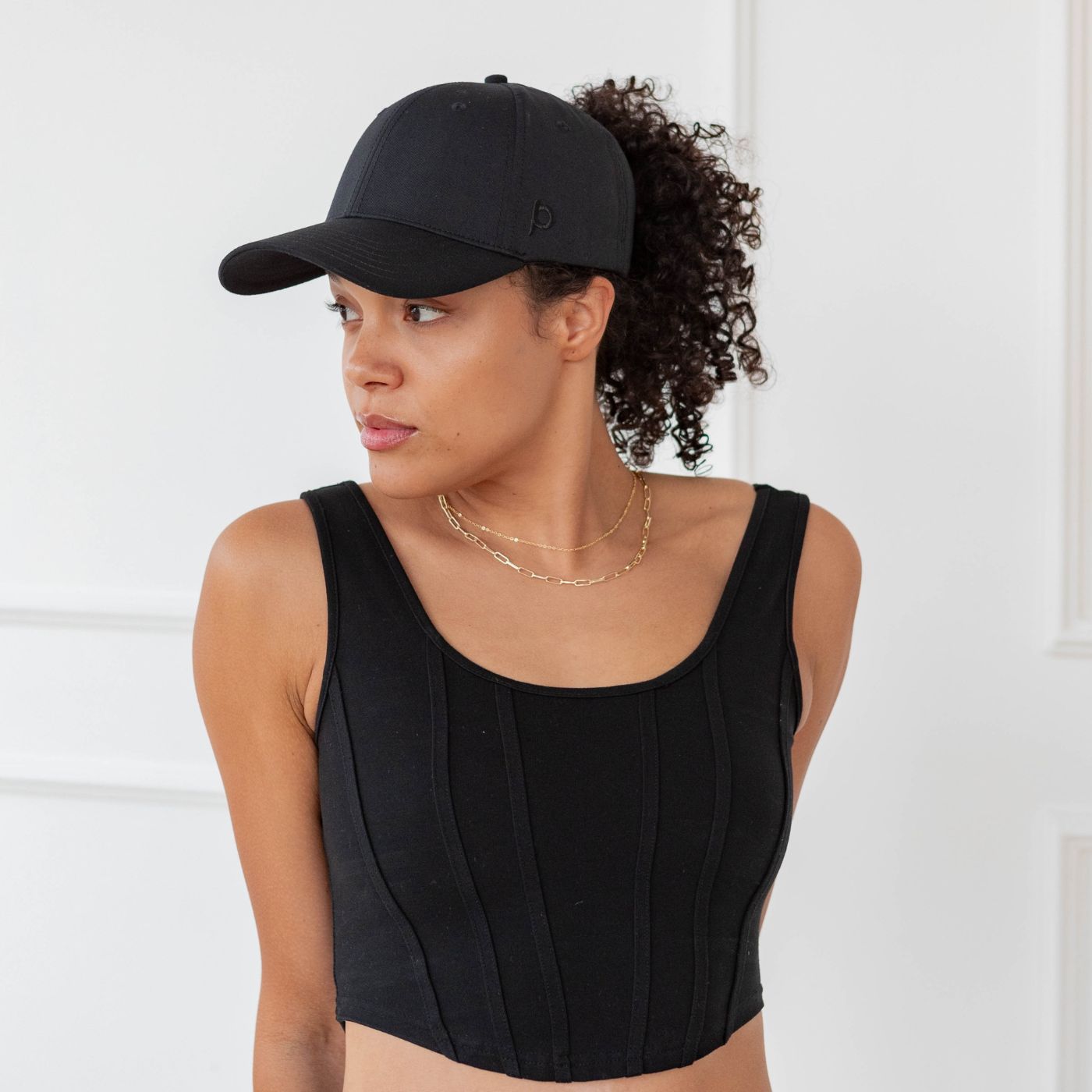 The Ponyback Luxe Fit combines the elevated quality of a high-end fitted hat with the revolutionary functionality of our patented magnetic back. The large back opening allows you to rock your hairstyle—whether it’s a high puff, curly bun, or low pony—at any height from the top button to the bottom of the band.